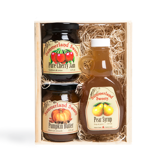 Easy to ship, this sampler gift pack is a great gift and is practical no matter how far it needs to travel to reach an intended recipient. One 125ml syrup and two 125ml jams make this a well rounded package for someone to try Summerland Sweets for the first time.