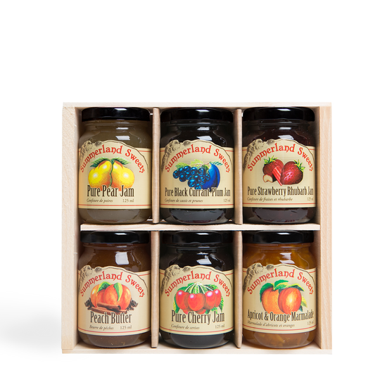 We really enjoy creating new flavours for our customers and sharing the fruit bounty of the Okanagan Valley with visitors. You will as well when you give this six jam gift package to someone special. These are created with the purist in mind and are made by adding 20% more fruit than is required in a pure fruit jam. No preservatives, nor artificial flavours or colours.
