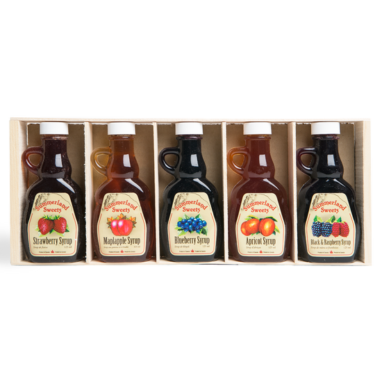 Five of our delicious 125 ml syrups for a friend, co-worker, or family to sample. Made from tree and vine ripened fruit, our syrups make a delicious topping for pancakes and waffles. They are also superb drizzled over crepes, ice cream or cheesecake or added to favourite vinaigrettes. This gift package of five of our best will please anyone receiving them.