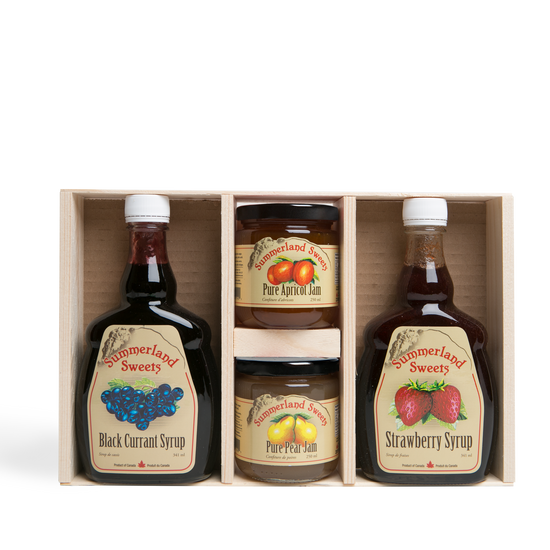 This larger sized gift box gives you the best of both of our jams and our syrups.  A good several months supply - memories of Sunday morning pancake breakfasts with the family are topped off beautifully with our traditional syrups and jams.