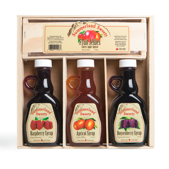 Our fruit jelly candies are a staple of Summerland Sweets and it was our first product developed back in the 60's. For this gift package we've also added three small syrups of 125ml each as a complement to the 156 gram box of assorted fruit jelly candies (Apple, Cherry & Apricot). An excellent combo!