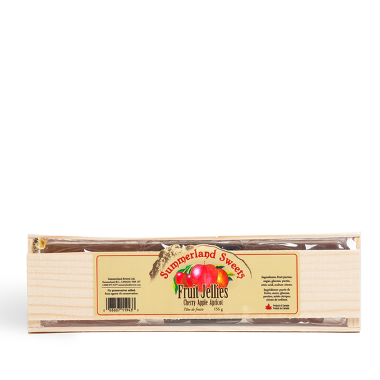 One of the best things about the Okanagan is our fruit bounty and this box of fruit jellies offers a perfect sampling. Made up of three different fruit varieties… Cherry, Apple, and Apricot it is a great representation of our crops. At 156 grams it is the perfect size to introduce a friend to Summerland Sweets.