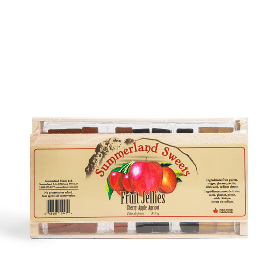 In our production area next to our store on a country road near Summerland, B.C. we still make our fruit jelly candies in small batches and once ready for packaging we hand cut them into small cubes. Assorted with Apple, Cherry and Apricot. 312 grams is a good size for a small family.